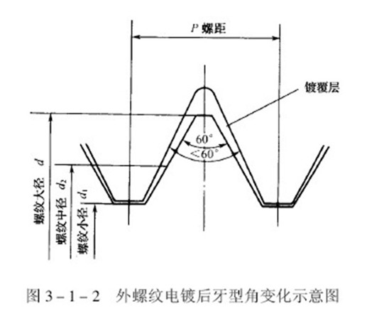 帶有普通螺紋的零件和緊固件,常遇到鍍覆后發(fā)生配合障礙的問(wèn)題。當(dāng)螺紋進(jìn)行電鍍時(shí),螺紋的牙尖部位和谷底部位的鍍層厚度是不一樣的,牙尖部位的鍍層厚度將明顯的大于谷底部位,隨著鍍層厚度的增加,它們之間的差異會(huì)越來(lái)越大,因此,螺紋的牙型角度變小,如圖所示。隨著螺紋直徑和螺距的不同,雖然牙尖和谷底部位鍍層厚度差異的比值也不同,但是隨著鍍層厚度增加,牙型角角度變小的傾向是始終如此的。螺紋直徑和螺距大一些,精度低一些,螺紋鍍后配合障礙就少一些,反之則多。實(shí)踐證明,螺紋電鍍后出現(xiàn)配合障礙的主要原因是牙型角鍍后的變形,其次才是鍍層厚度因素。