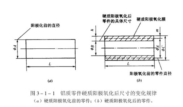 鋁及鋁合金表面上的硬質(zhì)陽(yáng)極氧化膜,具有較高的硬度和優(yōu)良的耐磨性,是改善鋁質(zhì)零件表面耐磨性的常用手段,為了提高零件的使用壽命,產(chǎn)品設(shè)計(jì)通常要求硬質(zhì)陽(yáng)極氧化膜層具有較大的厚度,因此,鋁質(zhì)零件硬質(zhì)陽(yáng)極化以后,零件的最終尺寸變化就比較大,通常遵循這樣的規(guī)律,就是零件最終尺寸的增大值,大體上等于膜層厚度的1/2,如圖所示。該數(shù)值被廣泛用于估算鋁質(zhì)零件硬質(zhì)陽(yáng)極化以后尺寸的變化規(guī)律。