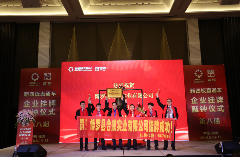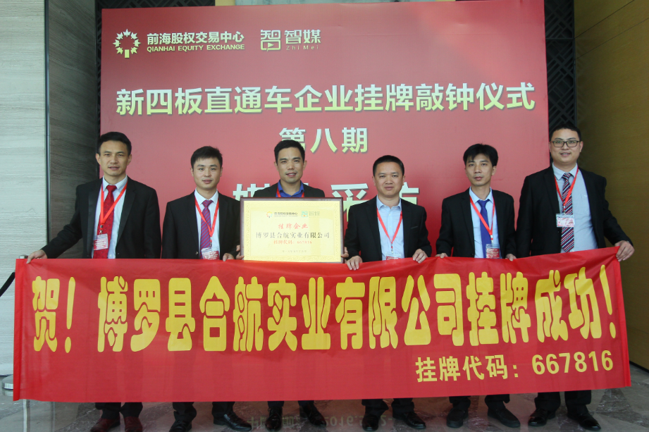 2016年5月15日,博羅縣合航實業有限公司在莊嚴的授牌敲鐘儀式中,正式進軍“新四板”,企業掛牌代碼:667816